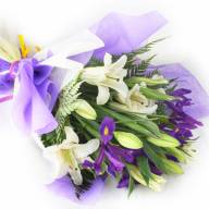 Вся прелесть букета в его лаконичности, неповторимости. Сочетание фиолетового и белого создает спокойную атмосферу, наполненную теплотой. Раскрываясь, бутоны лилии передают свою легкость и нежность, ирисы добавляют композиции яркости.